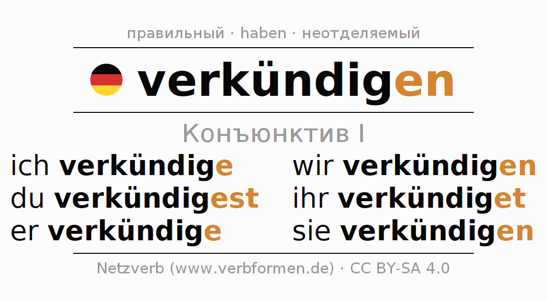 Спряжение verkündigen (возвещать, возвестить) в сослагательном наклонении I: ich verkündige, du verkündigest, er verkündige, wir verkündigen, ihr verkündiget, sie verkündigen.
