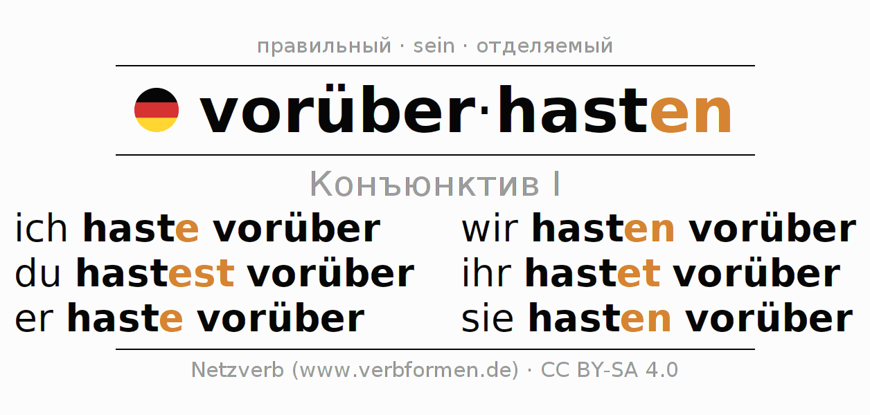 Спряжение vorüberhasten (пробежать мимо, проскочить) в сослагательном наклонении I: ich haste vorüber, du hastest vorüber, er haste vorüber, wir hasten vorüber, ihr hastet vorüber, sie hasten vorüber.