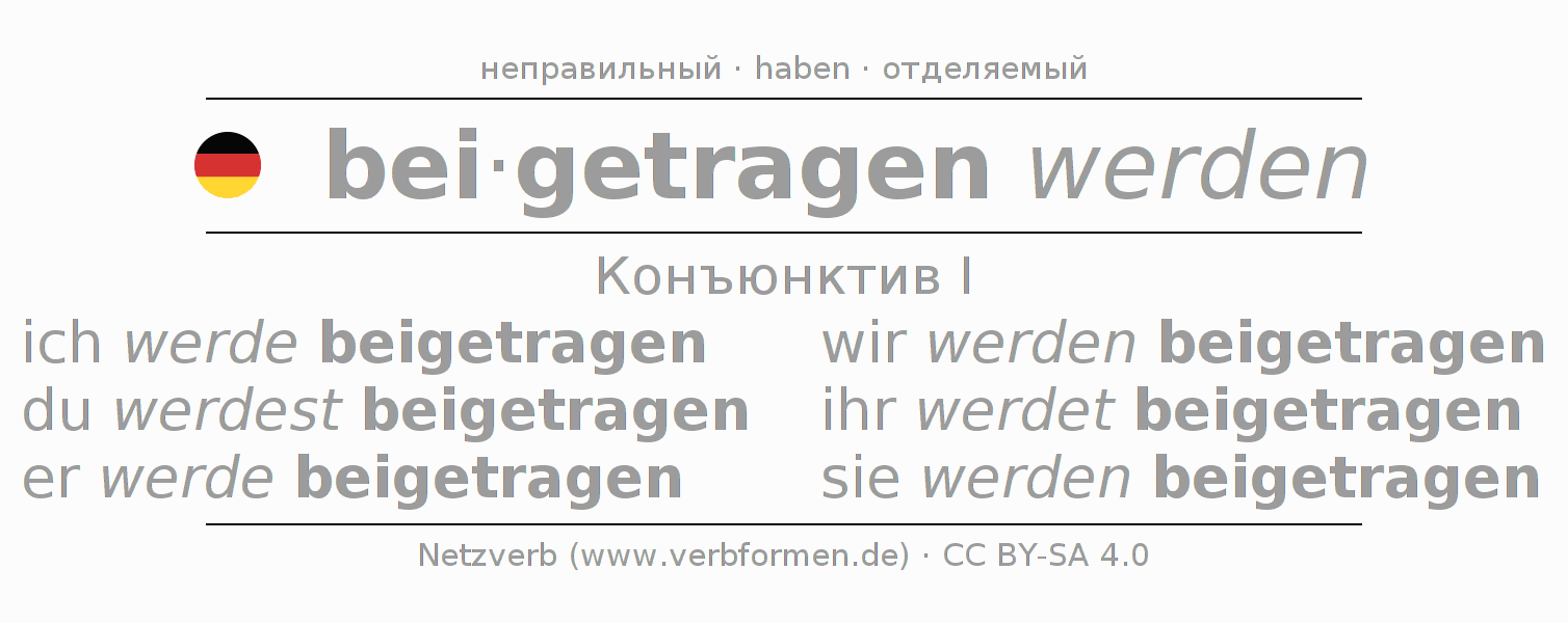 Спряжение beitragen в Koнъюнктив Презенс Сослагательное наклонение Пассив с werden: ich werde beigetragen, du werdest beigetragen, er werde beigetragen, wir werden beigetragen, ihr werdet beigetragen, sie werden beigetragen.Образование этих форм происходит по определённым грамматическим правилам. Так же спрягаются простые глагольные формы beitragen в Конъюнктив I. Kомментарии ☆