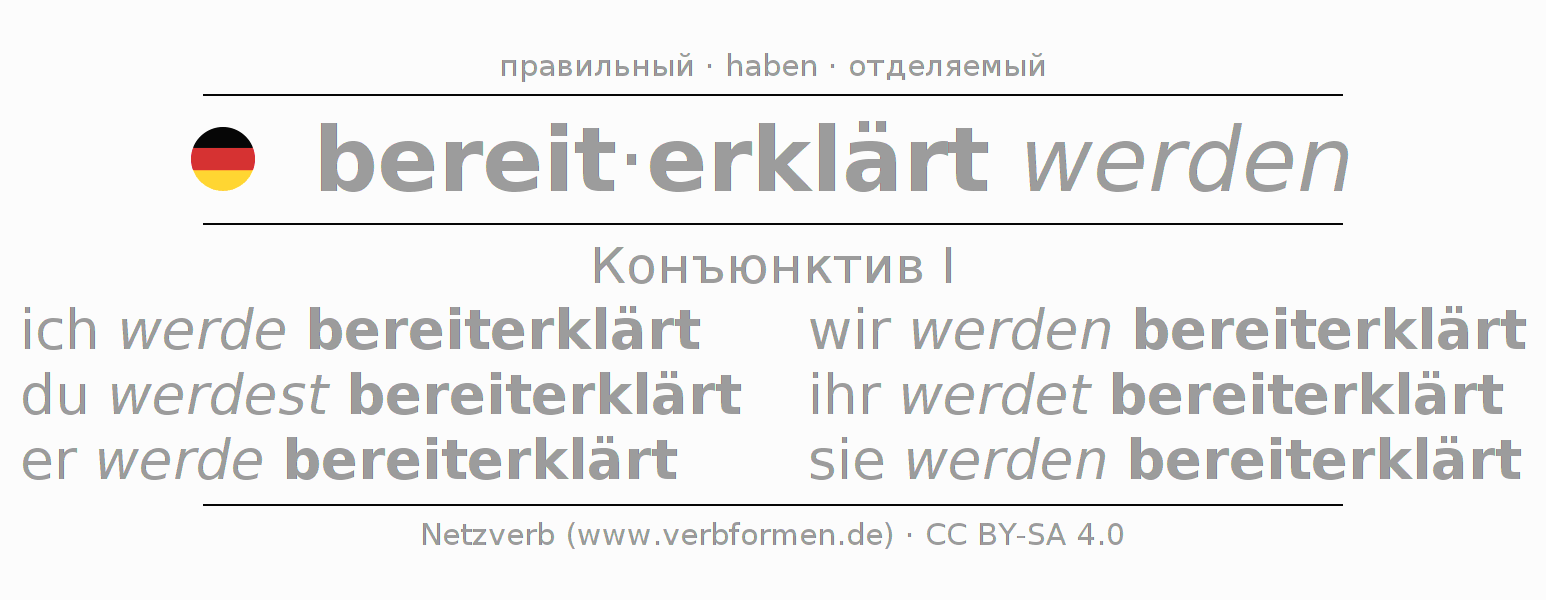 Спряжение bereiterklären в Koнъюнктив Презенс Сослагательное наклонение Пассив с werden: ich werde bereiterklärt, du werdest bereiterklärt, er werde bereiterklärt, wir werden bereiterklärt, ihr werdet bereiterklärt, sie werden bereiterklärt.Образование этих форм происходит по определённым грамматическим правилам. Так же спрягаются простые глагольные формы bereiterklären в Конъюнктив I. Kомментарии ☆