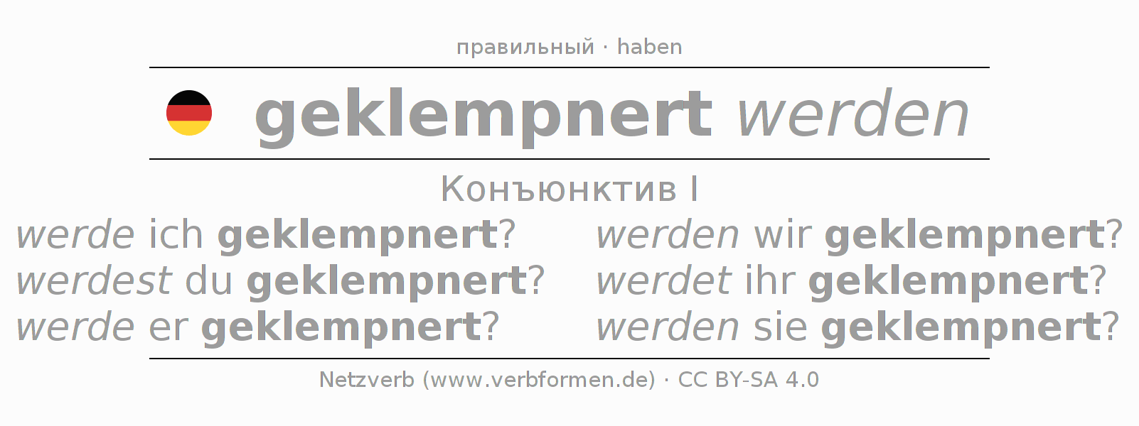 Спряжение klempnern в Koнъюнктив Презенс Сослагательное наклонение Пассив с werden: werde ich geklempnert?, werdest du geklempnert?, werde er geklempnert?, werden wir geklempnert?, werdet ihr geklempnert?, werden sie geklempnert?.Образование этих форм происходит по определённым грамматическим правилам. Так же спрягаются простые глагольные формы klempnern в Конъюнктив I. Kомментарии ☆