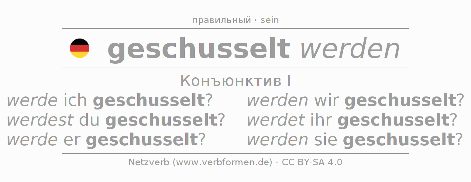 Спряжение schusseln в Koнъюнктив Презенс Сослагательное наклонение Пассив с werden: werde ich geschusselt?, werdest du geschusselt?, werde er geschusselt?, werden wir geschusselt?, werdet ihr geschusselt?, werden sie geschusselt?.Образование этих форм происходит по определённым грамматическим правилам. Так же спрягаются простые глагольные формы schusseln в Конъюнктив I. Kомментарии ☆