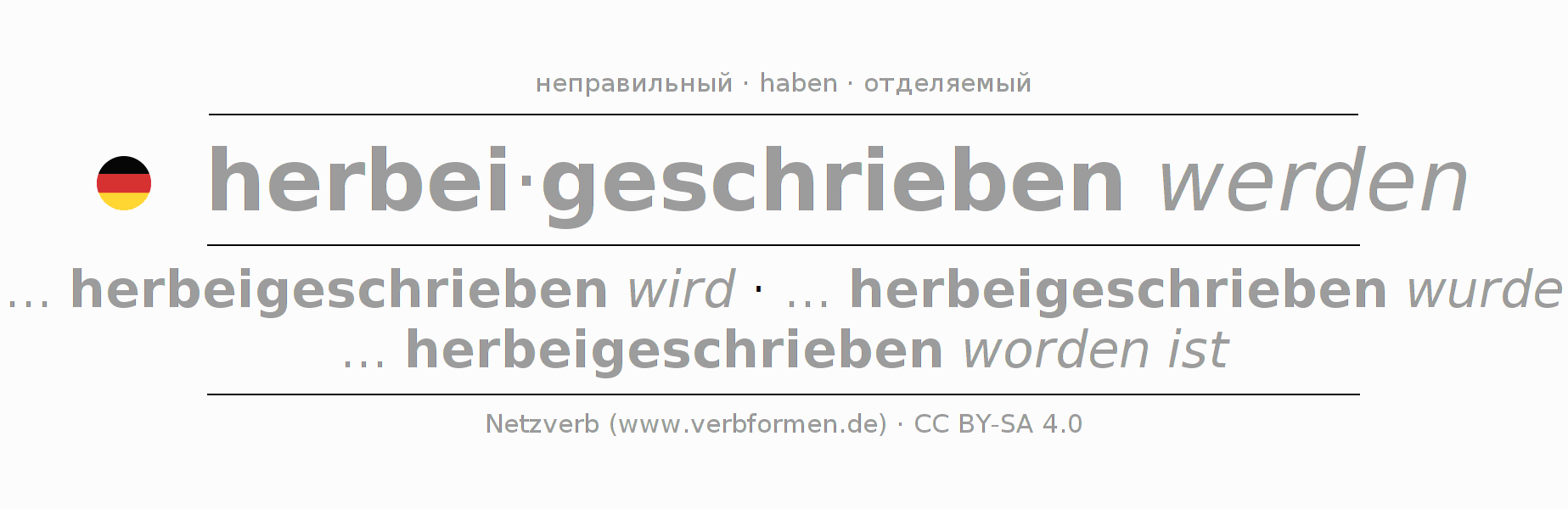 Спряжение herbeischreiben в Koнъюнктив Презенс Сослагательное наклонение Пассив с werden: ... ich herbeigeschrieben werde, ... du herbeigeschrieben werdest, ... er herbeigeschrieben werde, ... wir herbeigeschrieben werden, ... ihr herbeigeschrieben werdet, ... sie herbeigeschrieben werden.Образование этих форм происходит по определённым грамматическим правилам. Так же спрягаются простые глагольные формы herbeischreiben в Конъюнктив I. Kомментарии ☆