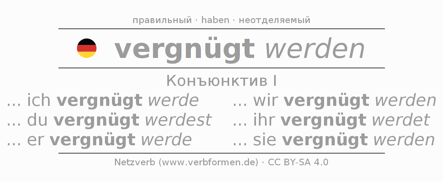Спряжение vergnügen в Koнъюнктив Презенс Сослагательное наклонение Пассив с werden: ... ich vergnügt werde, ... du vergnügt werdest, ... er vergnügt werde, ... wir vergnügt werden, ... ihr vergnügt werdet, ... sie vergnügt werden.Образование этих форм происходит по определённым грамматическим правилам. Так же спрягаются простые глагольные формы vergnügen в Конъюнктив I. Kомментарии ☆