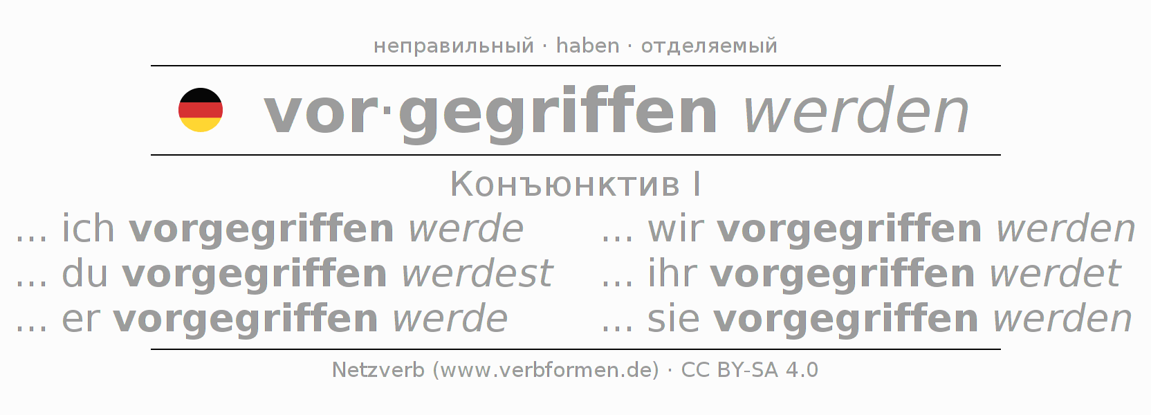 Спряжение vorgreifen в Koнъюнктив Презенс Сослагательное наклонение Пассив с werden: ... ich vorgegriffen werde, ... du vorgegriffen werdest, ... er vorgegriffen werde, ... wir vorgegriffen werden, ... ihr vorgegriffen werdet, ... sie vorgegriffen werden.Образование этих форм происходит по определённым грамматическим правилам. Так же спрягаются простые глагольные формы vorgreifen в Конъюнктив I. Kомментарии ☆