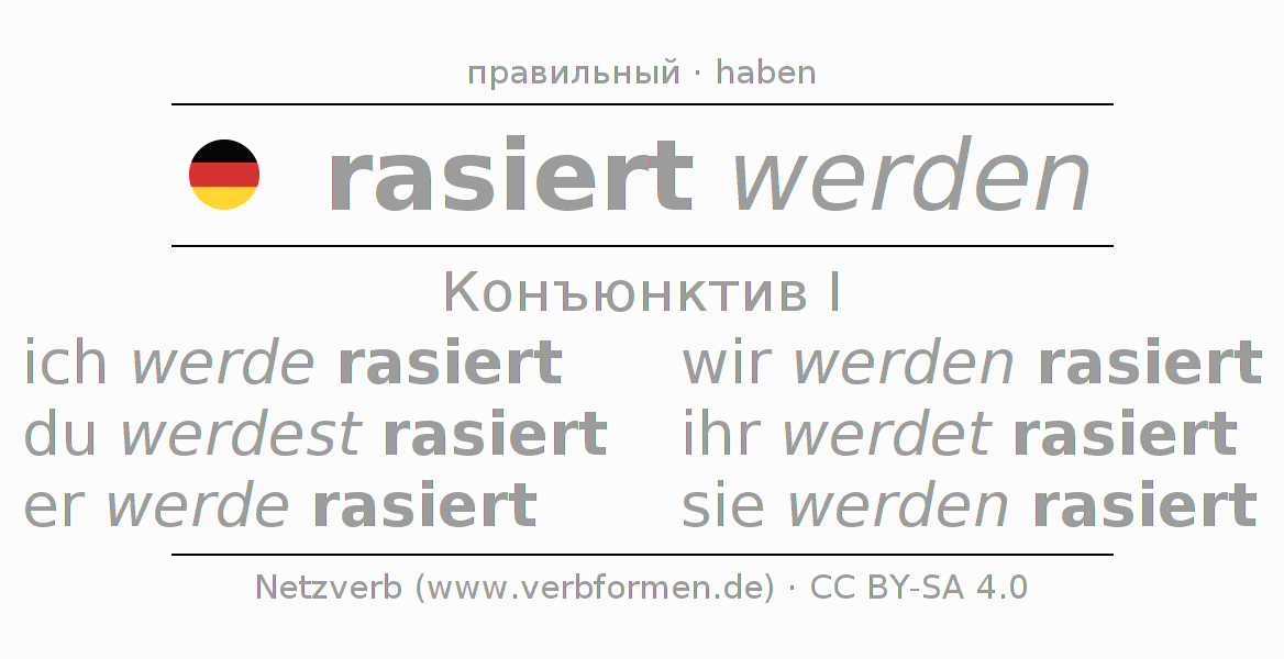 Спряжение rasieren в Koнъюнктив Презенс Сослагательное наклонение Пассив с werden: ich werde rasiert, du werdest rasiert, er werde rasiert, wir werden rasiert, ihr werdet rasiert, sie werden rasiert.Образование этих форм происходит по определённым грамматическим правилам. Так же спрягаются простые глагольные формы rasieren в Конъюнктив I. Kомментарии ☆