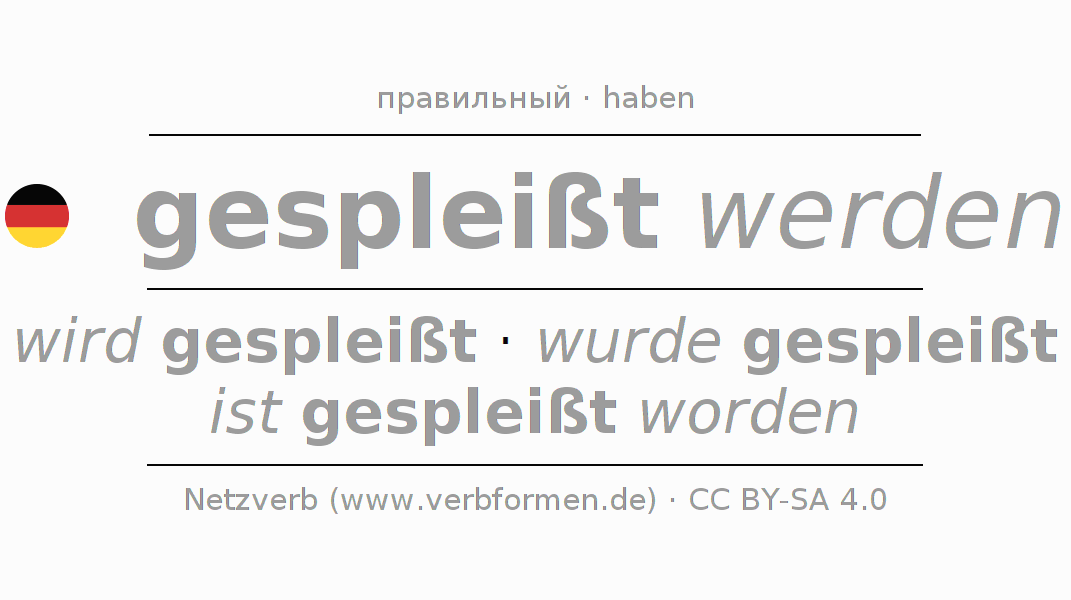 Спряжение spleißen в Koнъюнктив Презенс Сослагательное наклонение Пассив с werden: ich werde gespleißt, du werdest gespleißt, er werde gespleißt, wir werden gespleißt, ihr werdet gespleißt, sie werden gespleißt.Образование этих форм происходит по определённым грамматическим правилам. Так же спрягаются простые глагольные формы spleißen в Конъюнктив I. Kомментарии ☆
