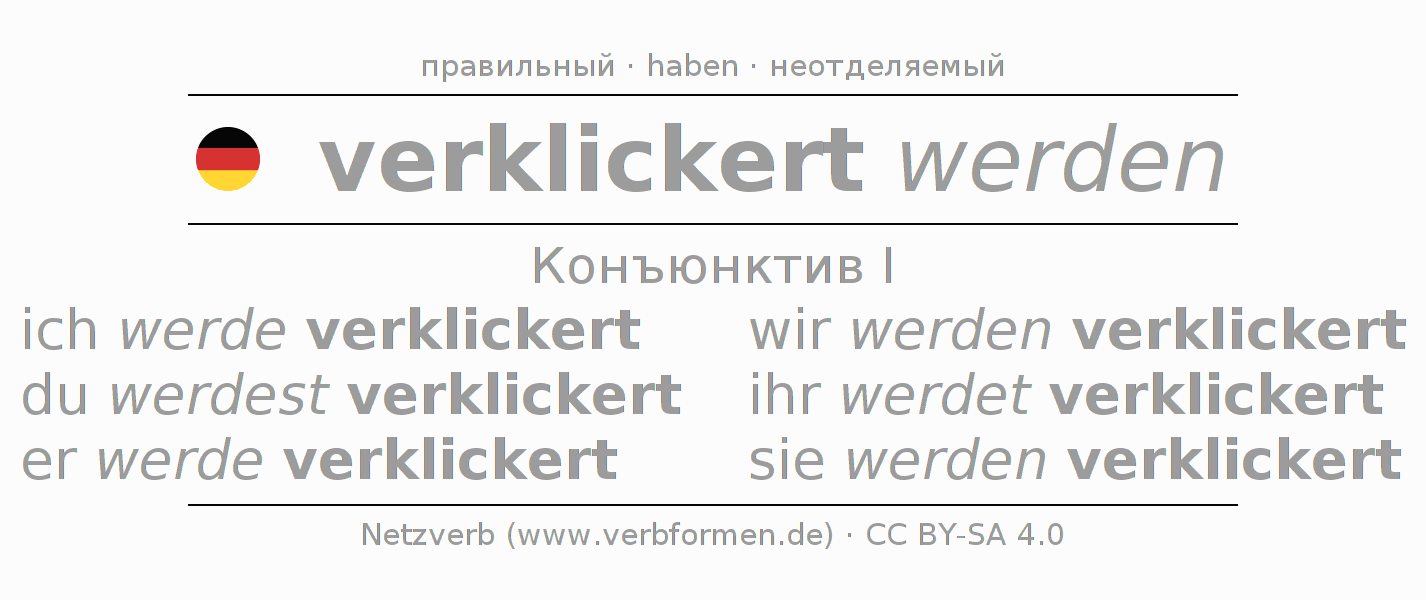 Спряжение verklickern в Koнъюнктив Презенс Сослагательное наклонение Пассив с werden: ich werde verklickert, du werdest verklickert, er werde verklickert, wir werden verklickert, ihr werdet verklickert, sie werden verklickert.Образование этих форм происходит по определённым грамматическим правилам. Так же спрягаются простые глагольные формы verklickern в Конъюнктив I. Kомментарии ☆