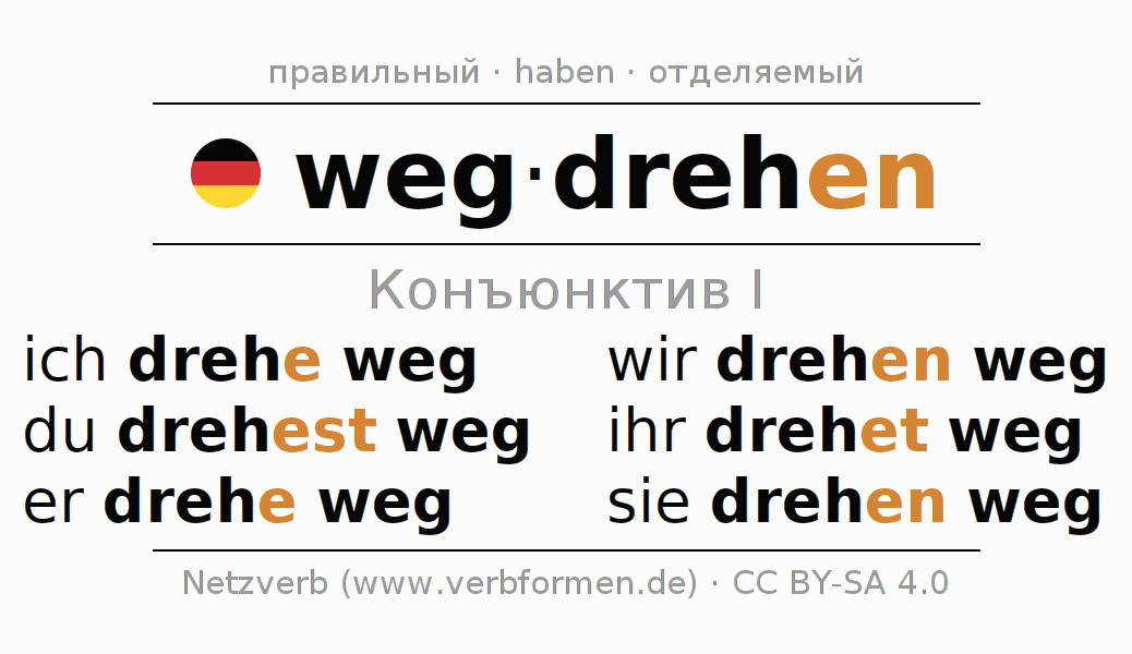 Спряжение wegdrehen (отворачиваться, отвернуть) в сослагательном наклонении I: ich drehe weg, du drehest weg, er drehe weg, wir drehen weg, ihr drehet weg, sie drehen weg.