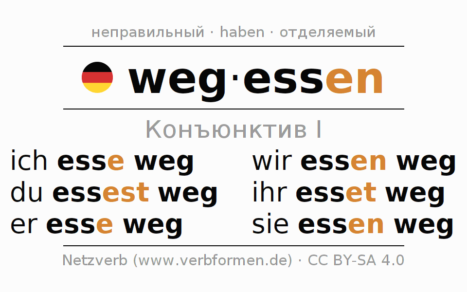 Спряжение wegessen (съесть, съесть чужое) в сослагательном наклонении I: ich esse weg, du essest weg, er esse weg, wir essen weg, ihr esset weg, sie essen weg.
