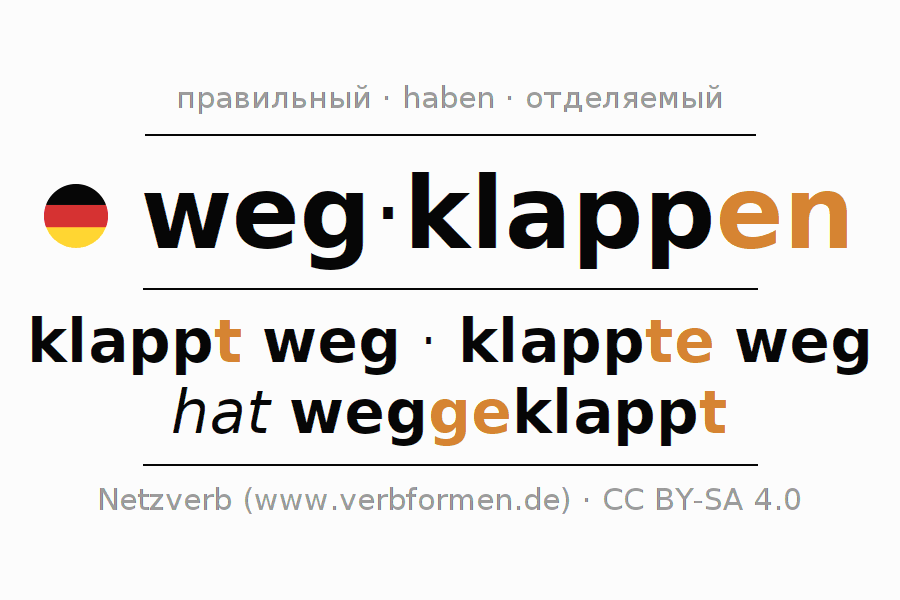 Спряжение wegklappen (закрыть, заснуть) в сослагательном наклонении I: ich klappe weg, du klappest weg, er klappe weg, wir klappen weg, ihr klappet weg, sie klappen weg.