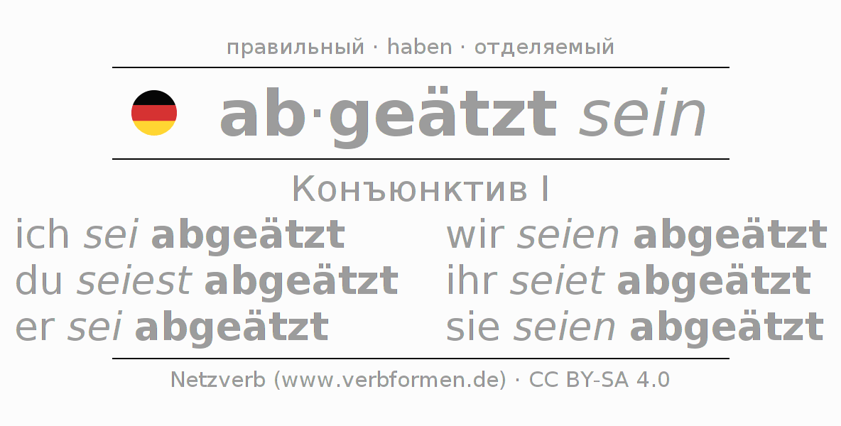 Спряжение abätzen в Koнъюнктив Презенс Сослагательное наклонение Пассив с sein: ich sei abgeätzt, du seiest abgeätzt, er sei abgeätzt, wir seien abgeätzt, ihr seiet abgeätzt, sie seien abgeätzt.Образование этих форм происходит по определённым грамматическим правилам. Так же спрягаются простые глагольные формы abätzen в Конъюнктив I. Kомментарии ☆