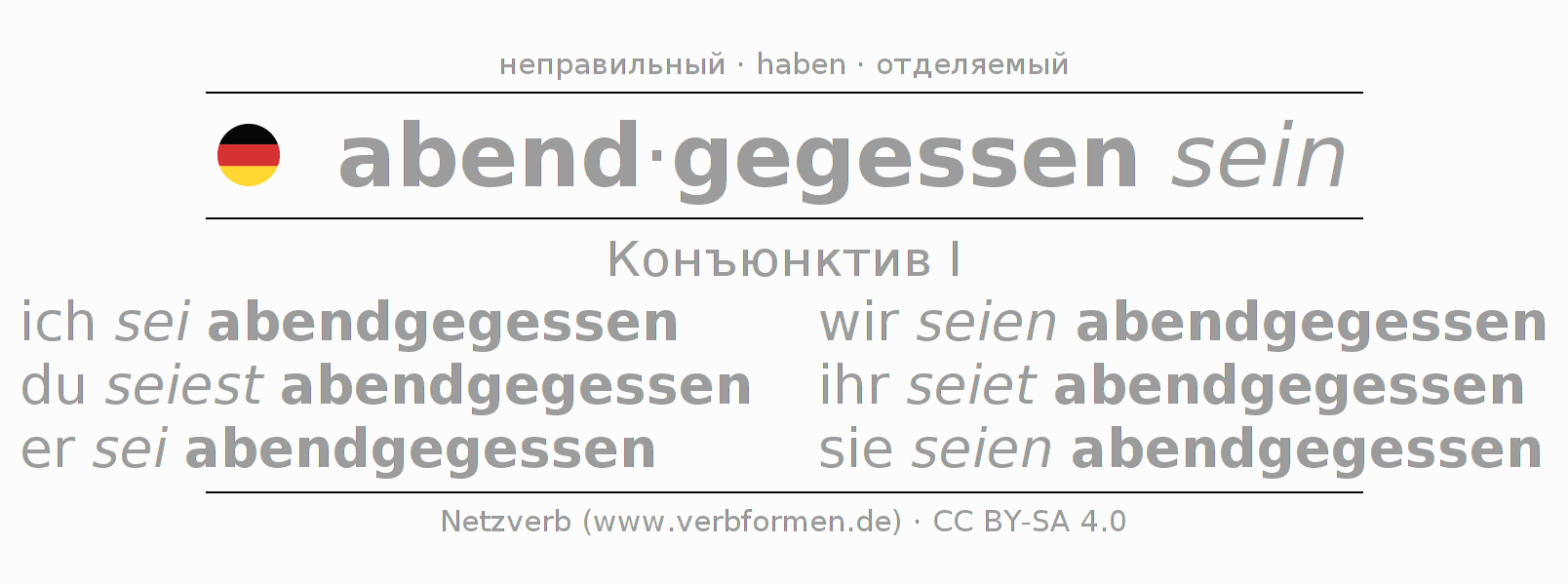Спряжение abendessen в Koнъюнктив Презенс Сослагательное наклонение Пассив с sein: ich sei abendgegessen, du seiest abendgegessen, er sei abendgegessen, wir seien abendgegessen, ihr seiet abendgegessen, sie seien abendgegessen.Образование этих форм происходит по определённым грамматическим правилам. Так же спрягаются простые глагольные формы abendessen в Конъюнктив I. Kомментарии ☆