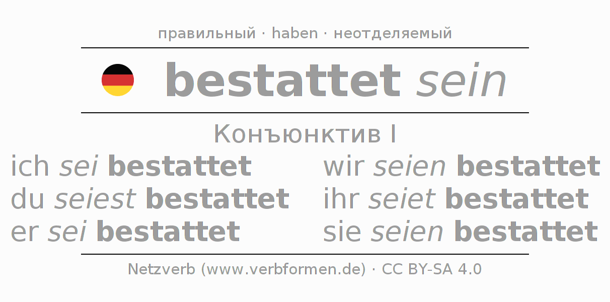 Спряжение bestatten в Koнъюнктив Презенс Сослагательное наклонение Пассив с sein: ich sei bestattet, du seiest bestattet, er sei bestattet, wir seien bestattet, ihr seiet bestattet, sie seien bestattet.Образование этих форм происходит по определённым грамматическим правилам. Так же спрягаются простые глагольные формы bestatten в Конъюнктив I. Kомментарии ☆