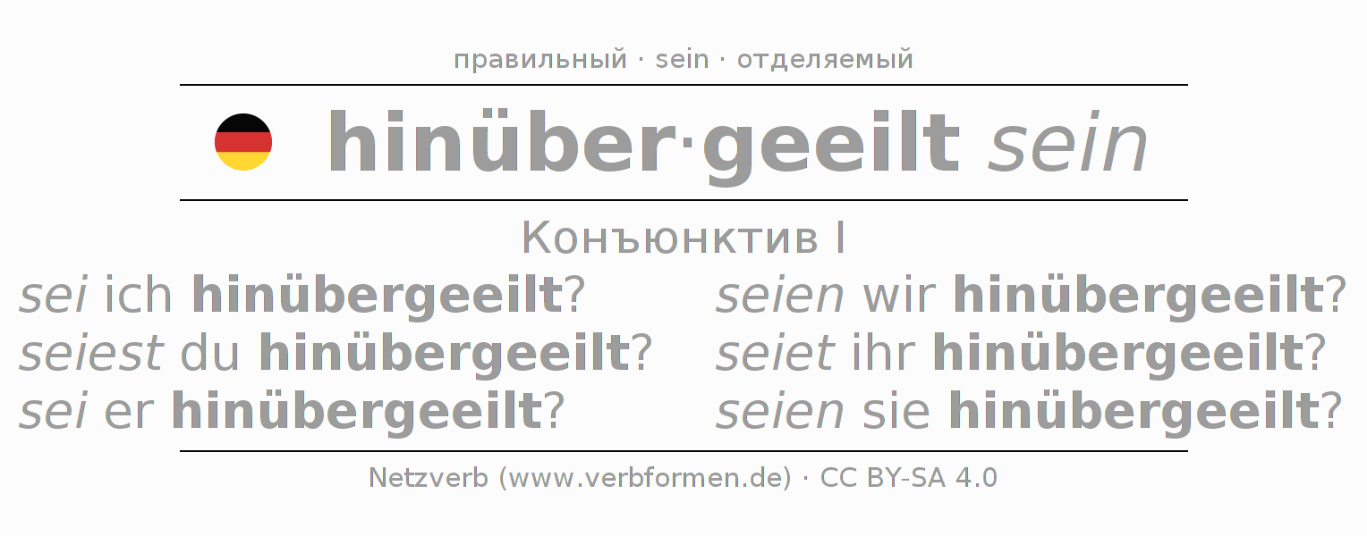 Спряжение hinübereilen в Koнъюнктив Презенс Сослагательное наклонение Пассив с sein: sei ich hinübergeeilt?, seiest du hinübergeeilt?, sei er hinübergeeilt?, seien wir hinübergeeilt?, seiet ihr hinübergeeilt?, seien sie hinübergeeilt?.Образование этих форм происходит по определённым грамматическим правилам. Так же спрягаются простые глагольные формы hinübereilen в Конъюнктив I. Kомментарии ☆