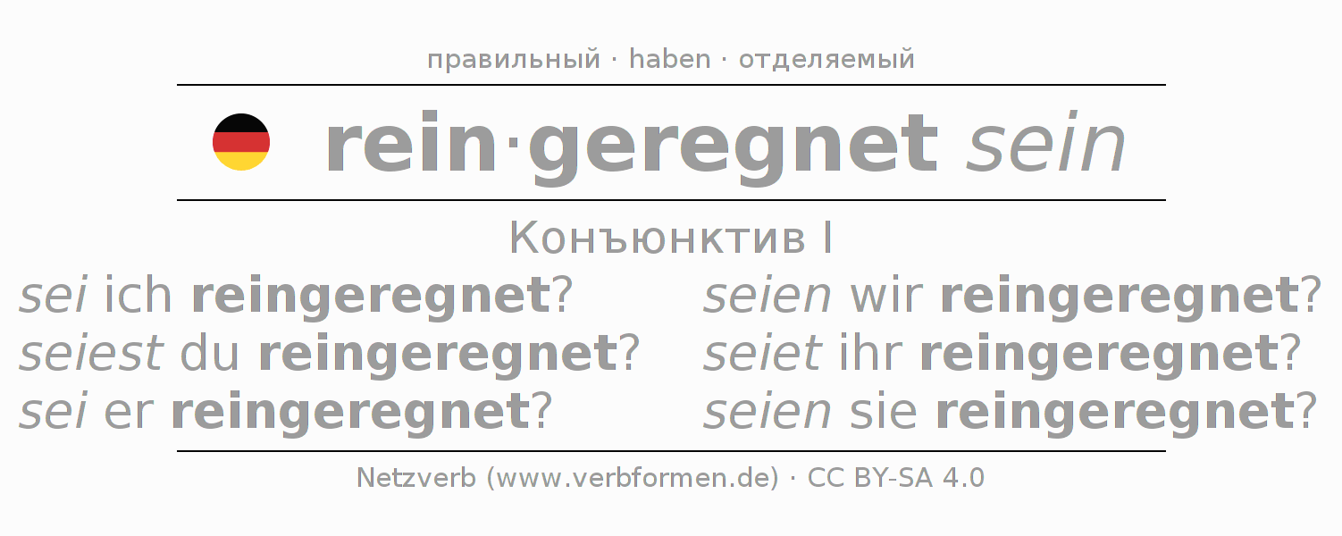 Спряжение reinregnen в Koнъюнктив Презенс Сослагательное наклонение Пассив с sein: sei ich reingeregnet?, seiest du reingeregnet?, sei er reingeregnet?, seien wir reingeregnet?, seiet ihr reingeregnet?, seien sie reingeregnet?.Образование этих форм происходит по определённым грамматическим правилам. Так же спрягаются простые глагольные формы reinregnen в Конъюнктив I. Kомментарии ☆
