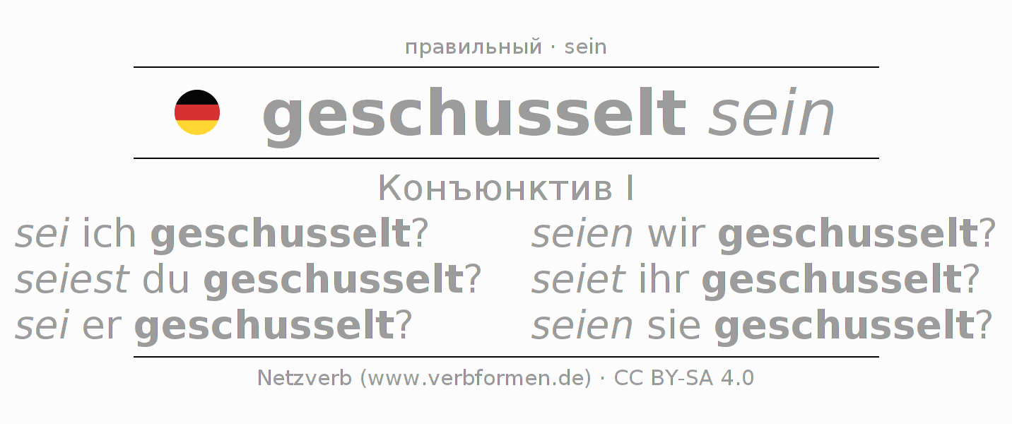 Спряжение schusseln в Koнъюнктив Презенс Сослагательное наклонение Пассив с sein: sei ich geschusselt?, seiest du geschusselt?, sei er geschusselt?, seien wir geschusselt?, seiet ihr geschusselt?, seien sie geschusselt?.Образование этих форм происходит по определённым грамматическим правилам. Так же спрягаются простые глагольные формы schusseln в Конъюнктив I. Kомментарии ☆