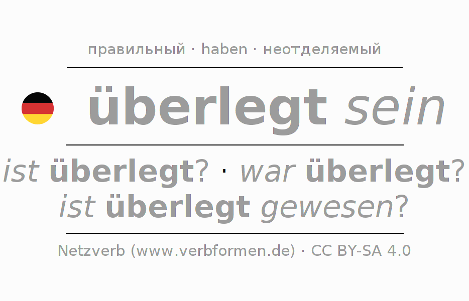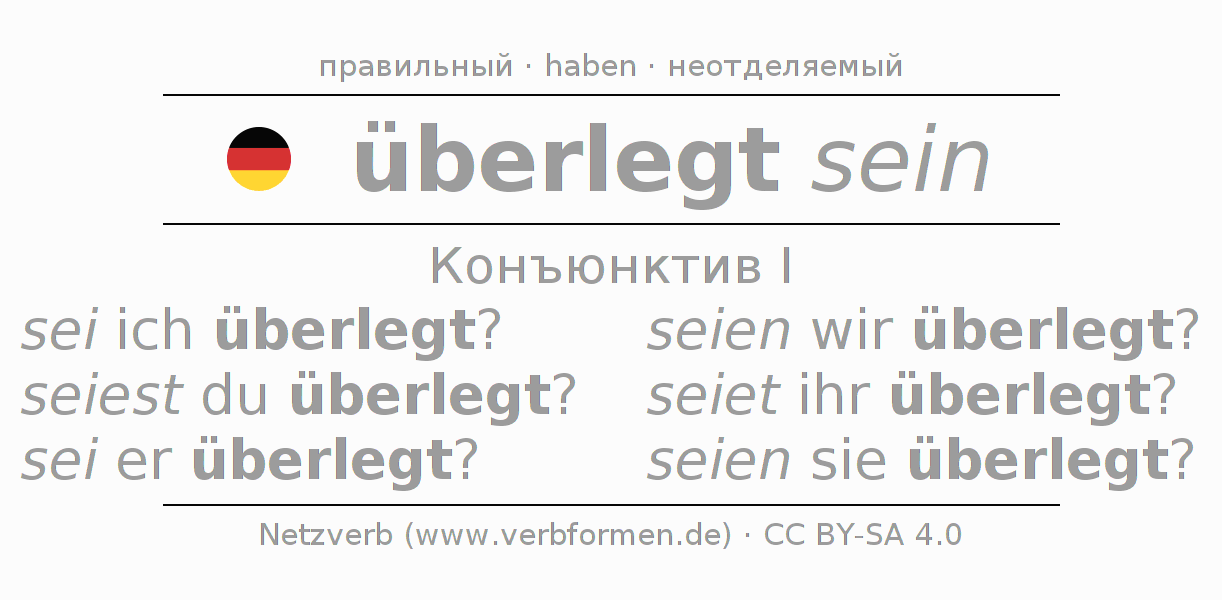 Спряжение überlegen в Koнъюнктив Презенс Сослагательное наклонение Пассив с sein: sei ich überlegt?, seiest du überlegt?, sei er überlegt?, seien wir überlegt?, seiet ihr überlegt?, seien sie überlegt?.Образование этих форм происходит по определённым грамматическим правилам. Так же спрягаются простые глагольные формы überlegen в Конъюнктив I. Kомментарии ☆