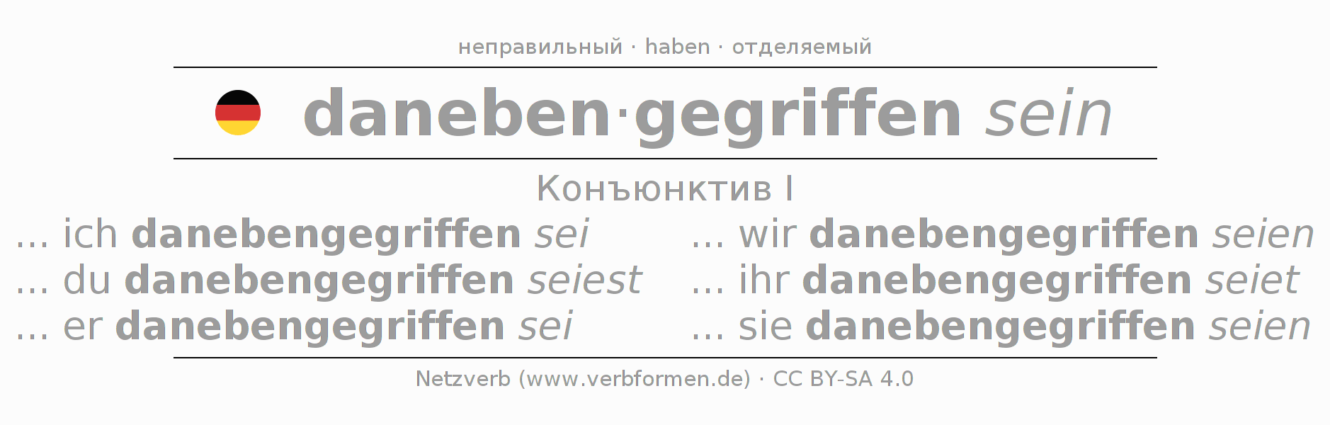 Спряжение danebengreifen в Koнъюнктив Презенс Сослагательное наклонение Пассив с sein: ... ich danebengegriffen sei, ... du danebengegriffen seiest, ... er danebengegriffen sei, ... wir danebengegriffen seien, ... ihr danebengegriffen seiet, ... sie danebengegriffen seien.Образование этих форм происходит по определённым грамматическим правилам. Так же спрягаются простые глагольные формы danebengreifen в Конъюнктив I. Kомментарии ☆