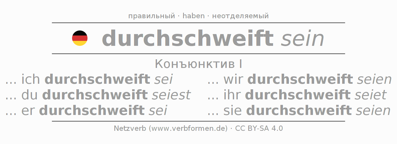 Спряжение durchschweifen в Koнъюнктив Презенс Сослагательное наклонение Пассив с sein: ... ich durchschweift sei, ... du durchschweift seiest, ... er durchschweift sei, ... wir durchschweift seien, ... ihr durchschweift seiet, ... sie durchschweift seien.Образование этих форм происходит по определённым грамматическим правилам. Так же спрягаются простые глагольные формы durchschweifen в Конъюнктив I. Kомментарии ☆