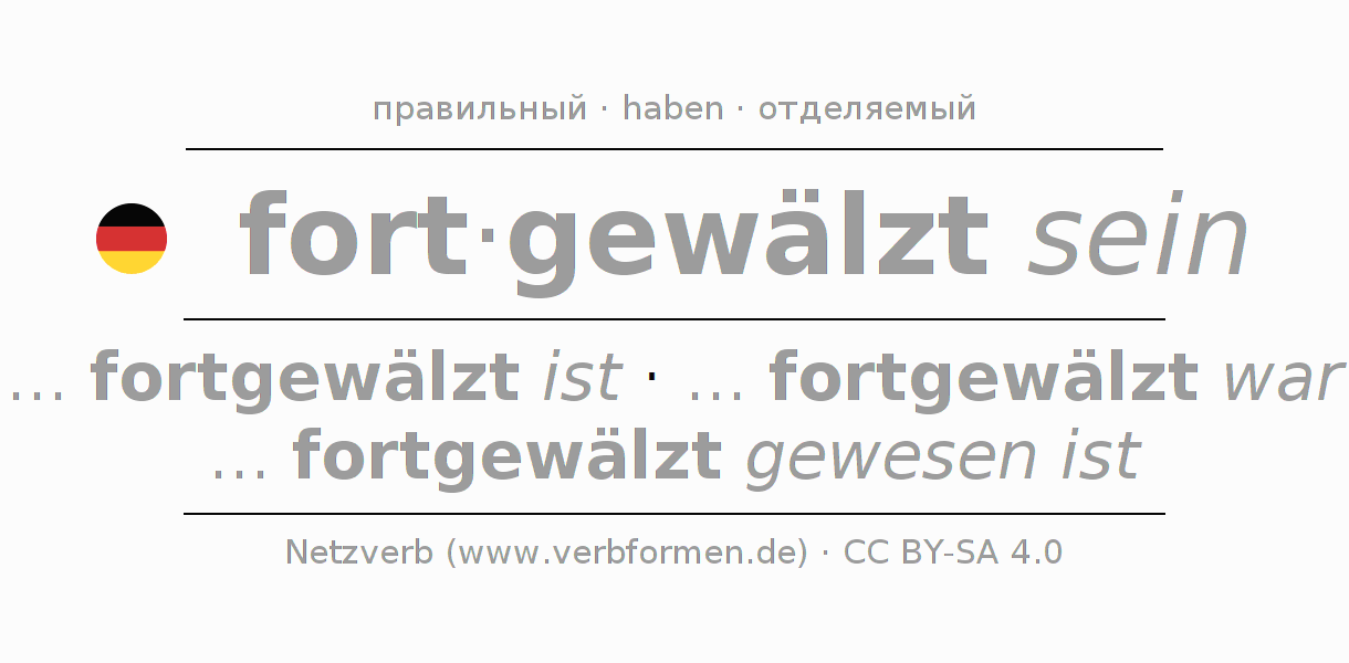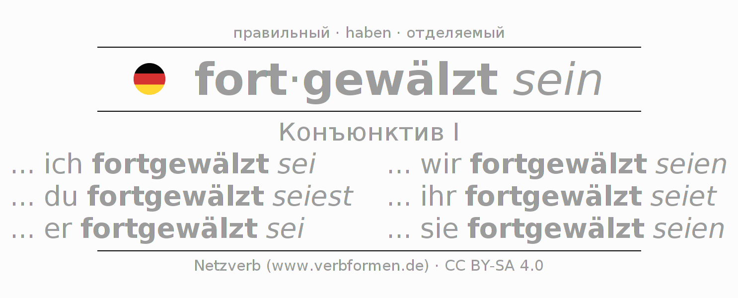 Спряжение fortwälzen в Koнъюнктив Презенс Сослагательное наклонение Пассив с sein: ... ich fortgewälzt sei, ... du fortgewälzt seiest, ... er fortgewälzt sei, ... wir fortgewälzt seien, ... ihr fortgewälzt seiet, ... sie fortgewälzt seien.Образование этих форм происходит по определённым грамматическим правилам. Так же спрягаются простые глагольные формы fortwälzen в Конъюнктив I. Kомментарии ☆