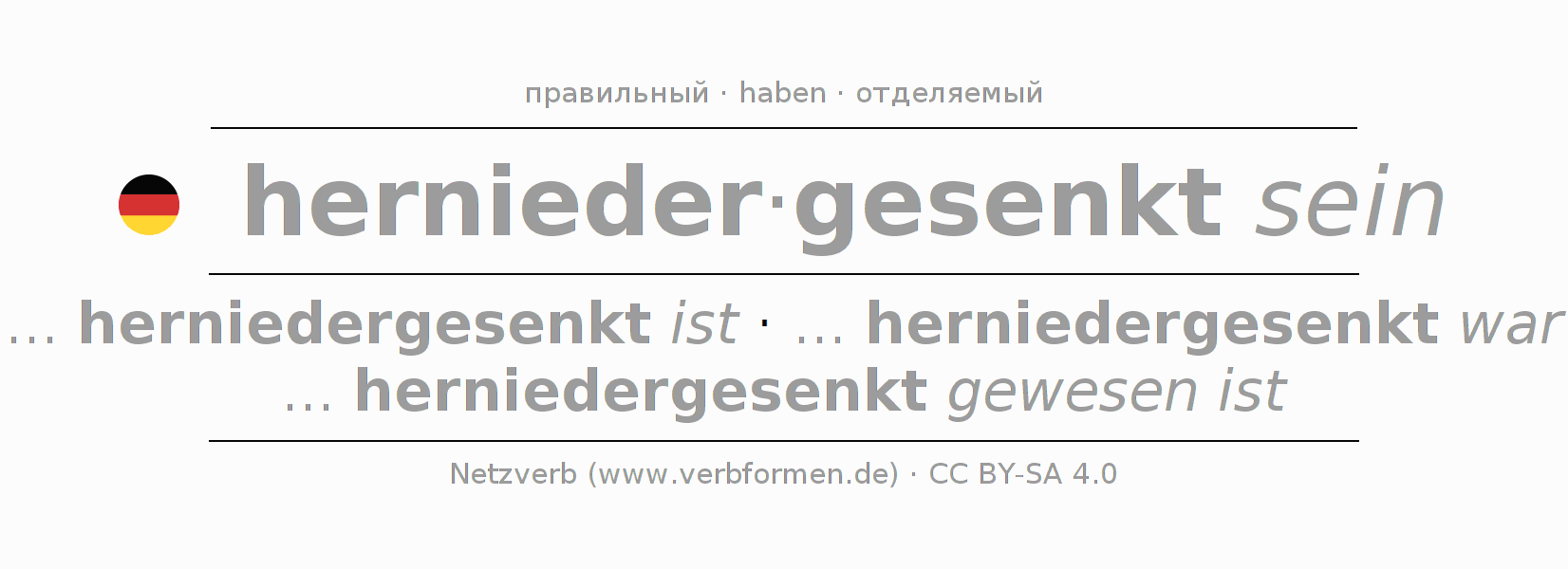 Спряжение herniedersenken в Koнъюнктив Презенс Сослагательное наклонение Пассив с sein: ... ich herniedergesenkt sei, ... du herniedergesenkt seiest, ... er herniedergesenkt sei, ... wir herniedergesenkt seien, ... ihr herniedergesenkt seiet, ... sie herniedergesenkt seien.Образование этих форм происходит по определённым грамматическим правилам. Так же спрягаются простые глагольные формы herniedersenken в Конъюнктив I. Kомментарии ☆