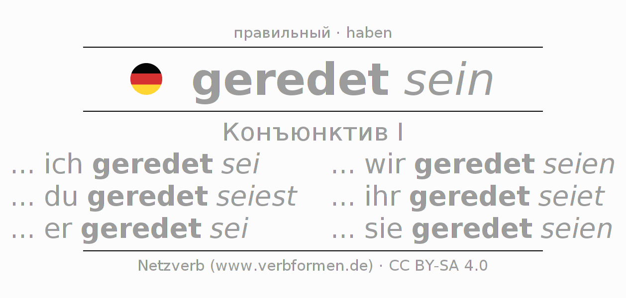 Спряжение reden в Koнъюнктив Презенс Сослагательное наклонение Пассив с sein: ... ich geredet sei, ... du geredet seiest, ... er geredet sei, ... wir geredet seien, ... ihr geredet seiet, ... sie geredet seien.Образование этих форм происходит по определённым грамматическим правилам. Так же спрягаются простые глагольные формы reden в Конъюнктив I. Kомментарии ☆