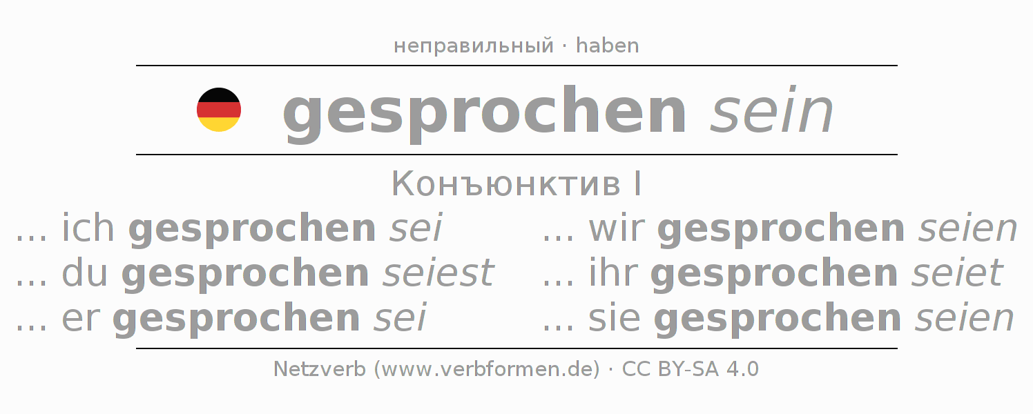 Спряжение sprechen в Koнъюнктив Презенс Сослагательное наклонение Пассив с sein: ... ich gesprochen sei, ... du gesprochen seiest, ... er gesprochen sei, ... wir gesprochen seien, ... ihr gesprochen seiet, ... sie gesprochen seien.Образование этих форм происходит по определённым грамматическим правилам. Так же спрягаются простые глагольные формы sprechen в Конъюнктив I. 1Комментарий ☆