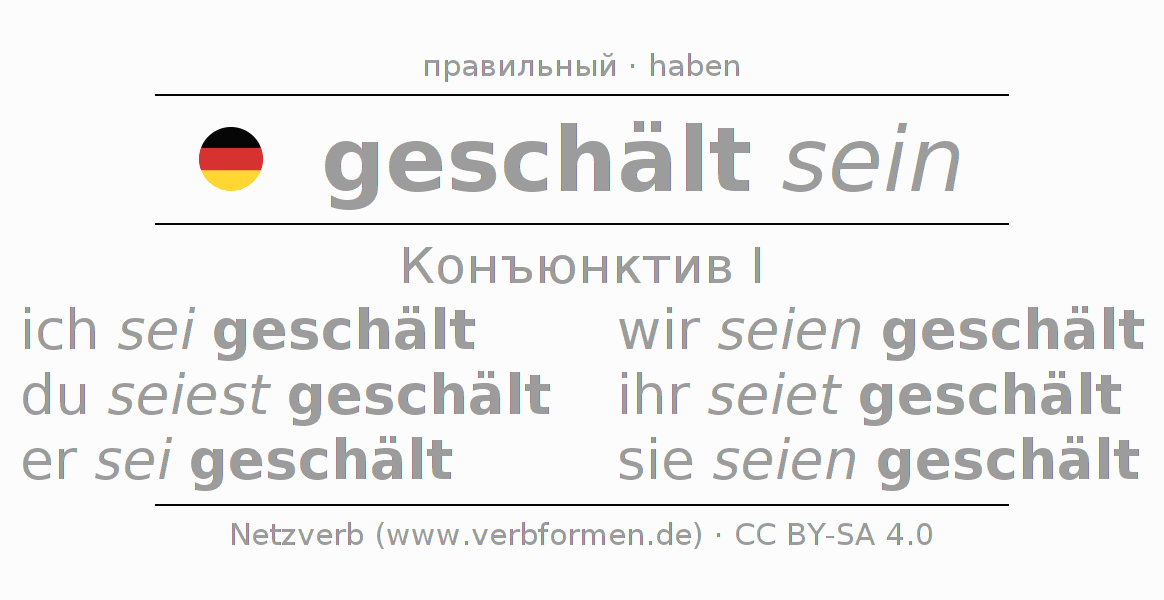 Спряжение schälen в Koнъюнктив Презенс Сослагательное наклонение Пассив с sein: ich sei geschält, du seiest geschält, er sei geschält, wir seien geschält, ihr seiet geschält, sie seien geschält.Образование этих форм происходит по определённым грамматическим правилам. Так же спрягаются простые глагольные формы schälen в Конъюнктив I. Kомментарии ☆
