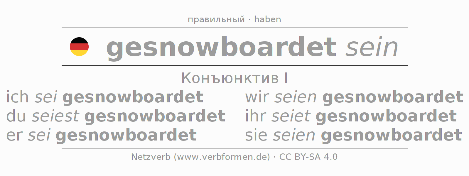 Этот глагол snowboarden (hat) полностью спрягается во всех лицах и числах Koнъюнктив Презенс.
