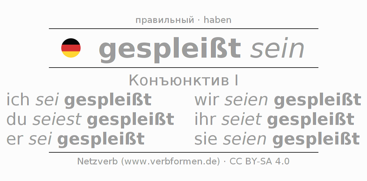 Спряжение spleißen в Koнъюнктив Презенс Сослагательное наклонение Пассив с sein: ich sei gespleißt, du seiest gespleißt, er sei gespleißt, wir seien gespleißt, ihr seiet gespleißt, sie seien gespleißt.Образование этих форм происходит по определённым грамматическим правилам. Так же спрягаются простые глагольные формы spleißen в Конъюнктив I. Kомментарии ☆