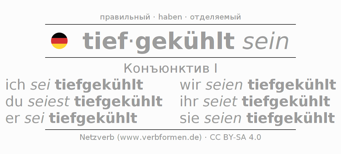 Спряжение tiefkühlen в Koнъюнктив Презенс Сослагательное наклонение Пассив с sein: ich sei tiefgekühlt, du seiest tiefgekühlt, er sei tiefgekühlt, wir seien tiefgekühlt, ihr seiet tiefgekühlt, sie seien tiefgekühlt.Образование этих форм происходит по определённым грамматическим правилам. Так же спрягаются простые глагольные формы tiefkühlen в Конъюнктив I. Kомментарии ☆