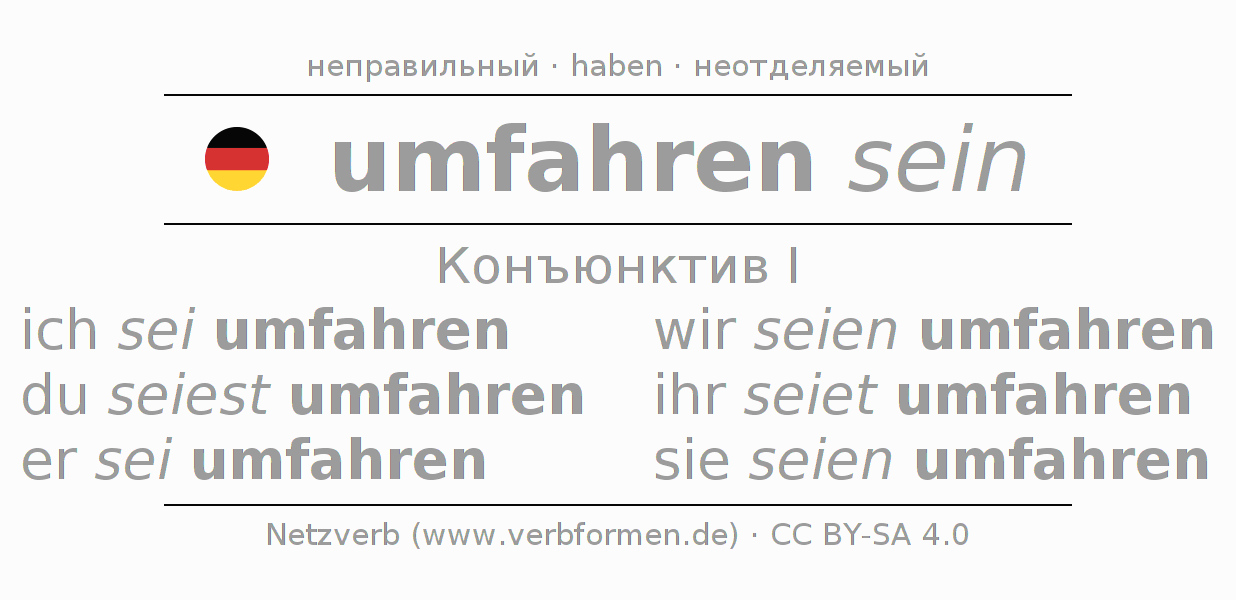 Спряжение umfahren в Koнъюнктив Презенс Сослагательное наклонение Пассив с sein: ich sei umfahren, du seiest umfahren, er sei umfahren, wir seien umfahren, ihr seiet umfahren, sie seien umfahren.Образование этих форм происходит по определённым грамматическим правилам. Так же спрягаются простые глагольные формы umfahren в Конъюнктив I. Kомментарии ☆