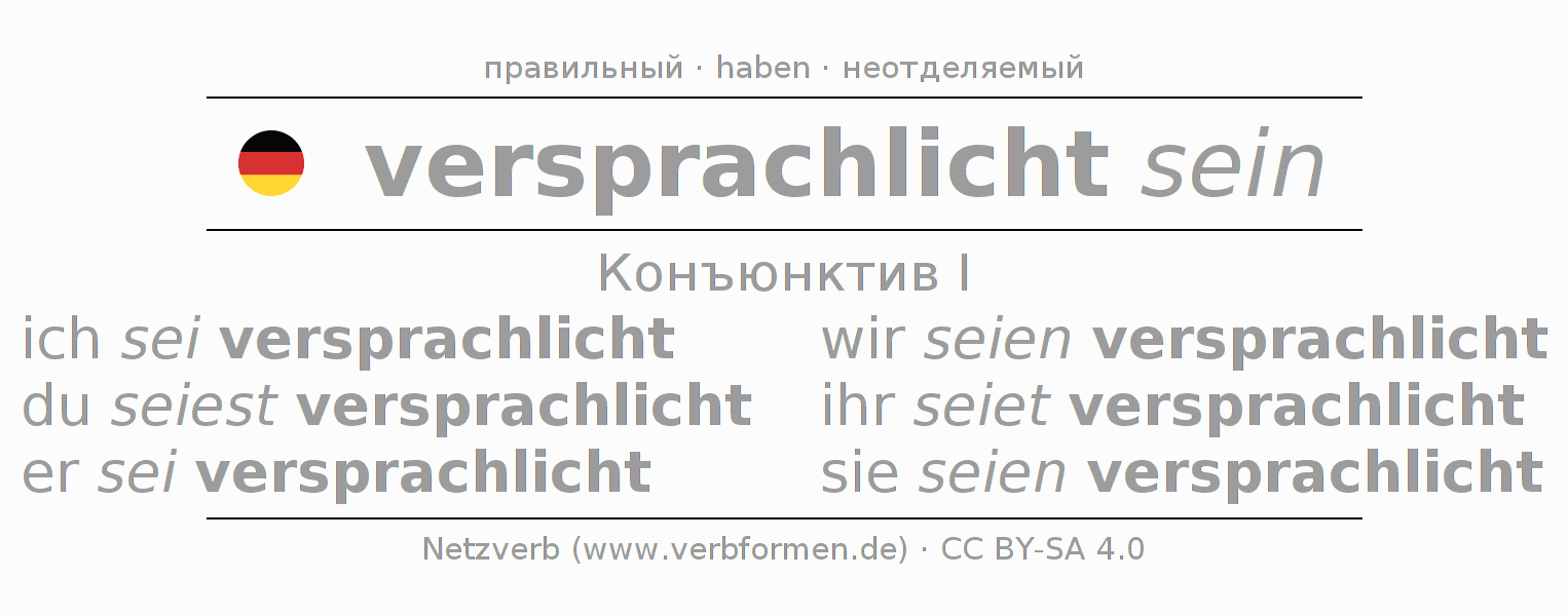 Спряжение versprachlichen в Koнъюнктив Презенс Сослагательное наклонение Пассив с sein: ich sei versprachlicht, du seiest versprachlicht, er sei versprachlicht, wir seien versprachlicht, ihr seiet versprachlicht, sie seien versprachlicht.Образование этих форм происходит по определённым грамматическим правилам. Так же спрягаются простые глагольные формы versprachlichen в Конъюнктив I. Kомментарии ☆