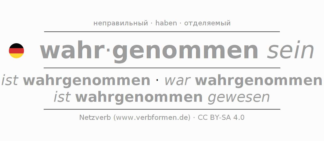 Спряжение wahrnehmen в Koнъюнктив Презенс Сослагательное наклонение Пассив с sein: ich sei wahrgenommen, du seiest wahrgenommen, er sei wahrgenommen, wir seien wahrgenommen, ihr seiet wahrgenommen, sie seien wahrgenommen.Образование этих форм происходит по определённым грамматическим правилам. Так же спрягаются простые глагольные формы wahrnehmen в Конъюнктив I. Kомментарии ☆