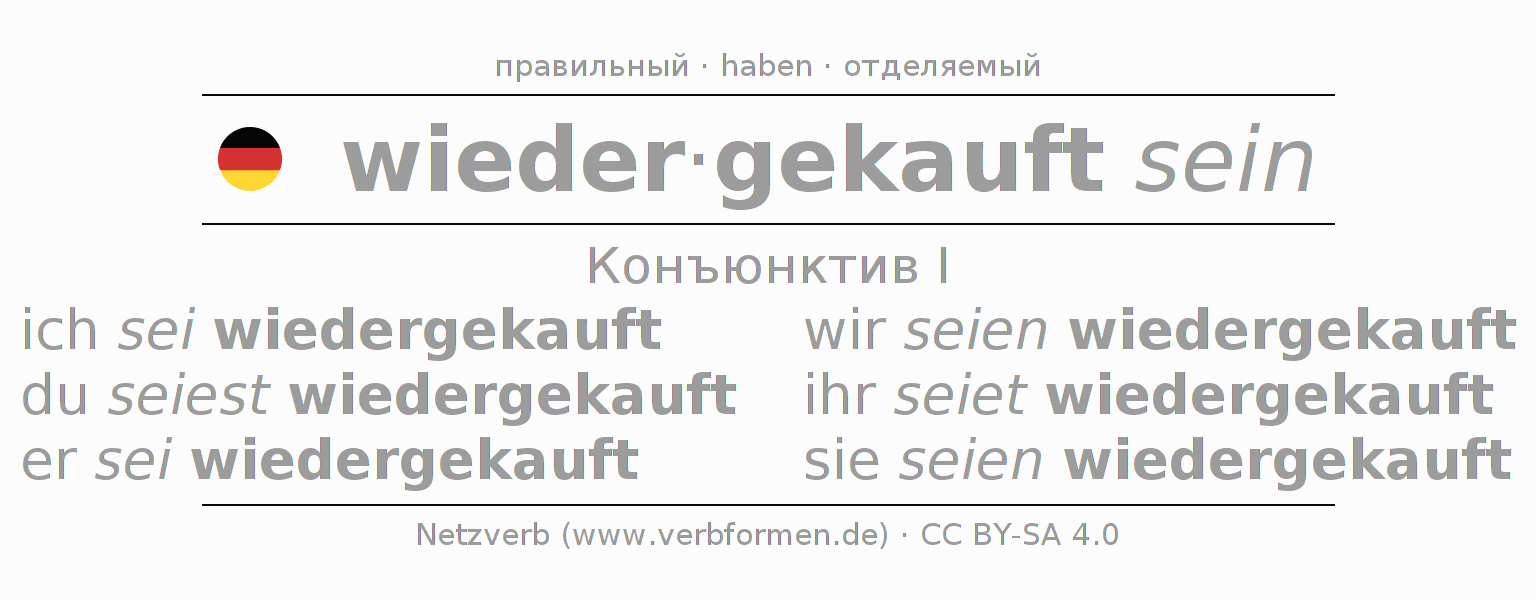 Спряжение wiederkaufen в Koнъюнктив Презенс Сослагательное наклонение Пассив с sein: ich sei wiedergekauft, du seiest wiedergekauft, er sei wiedergekauft, wir seien wiedergekauft, ihr seiet wiedergekauft, sie seien wiedergekauft.Образование этих форм происходит по определённым грамматическим правилам. Так же спрягаются простые глагольные формы wiederkaufen в Конъюнктив I. Kомментарии ☆