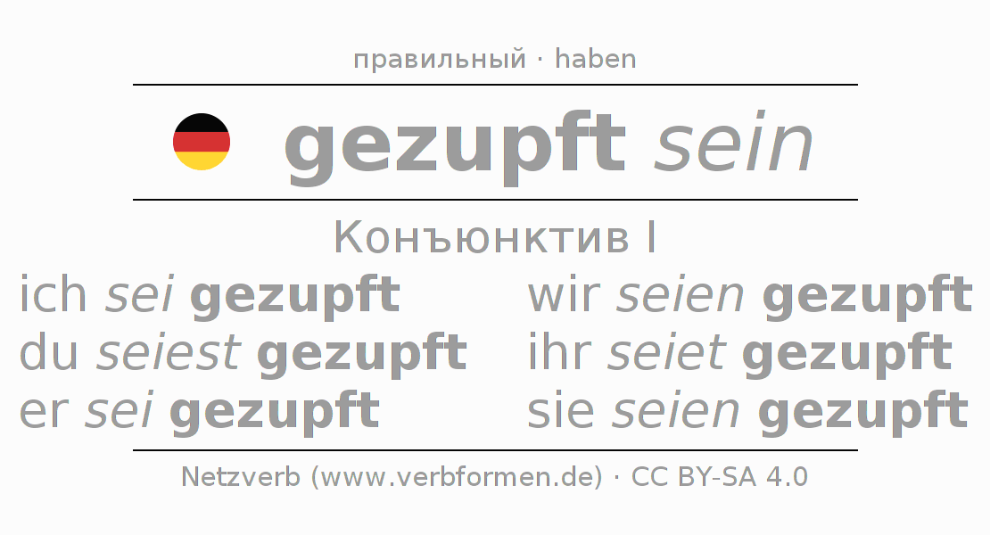 Спряжение zupfen в Koнъюнктив Презенс Сослагательное наклонение Пассив с sein: ich sei gezupft, du seiest gezupft, er sei gezupft, wir seien gezupft, ihr seiet gezupft, sie seien gezupft.Образование этих форм происходит по определённым грамматическим правилам. Так же спрягаются простые глагольные формы zupfen в Конъюнктив I. Kомментарии ☆