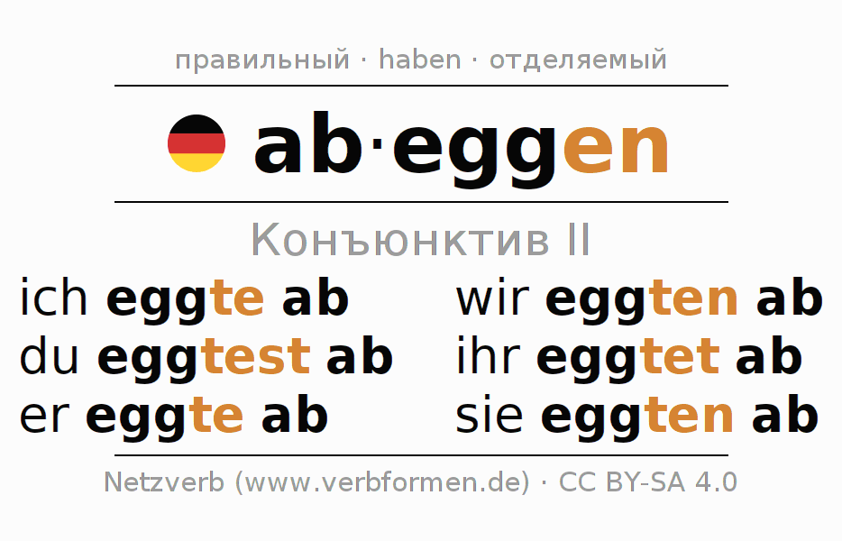 Спряжение abeggen (бороновать, взбороновать) в сослагательном наклонении II: ich eggte ab, du eggtest ab, er eggte ab, wir eggten ab, ihr eggtet ab, sie eggten ab