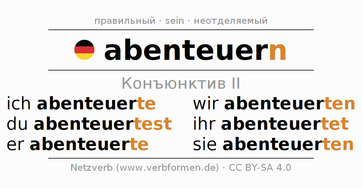 Спряжение abenteuern (искать приключений, пускаться на авантюры) в сослагательном наклонении II: ich abenteuerte, du abenteuertest, er abenteuerte, wir abenteuerten, ihr abenteuertet, sie abenteuerten