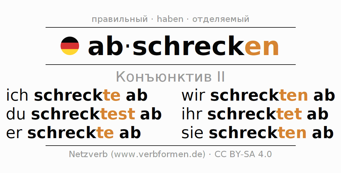 Спряжение abschrecken (отпугивать, быстро охлаждать) в сослагательном наклонении II: ich schreckte ab, du schrecktest ab, er schreckte ab, wir schreckten ab, ihr schrecktet ab, sie schreckten ab