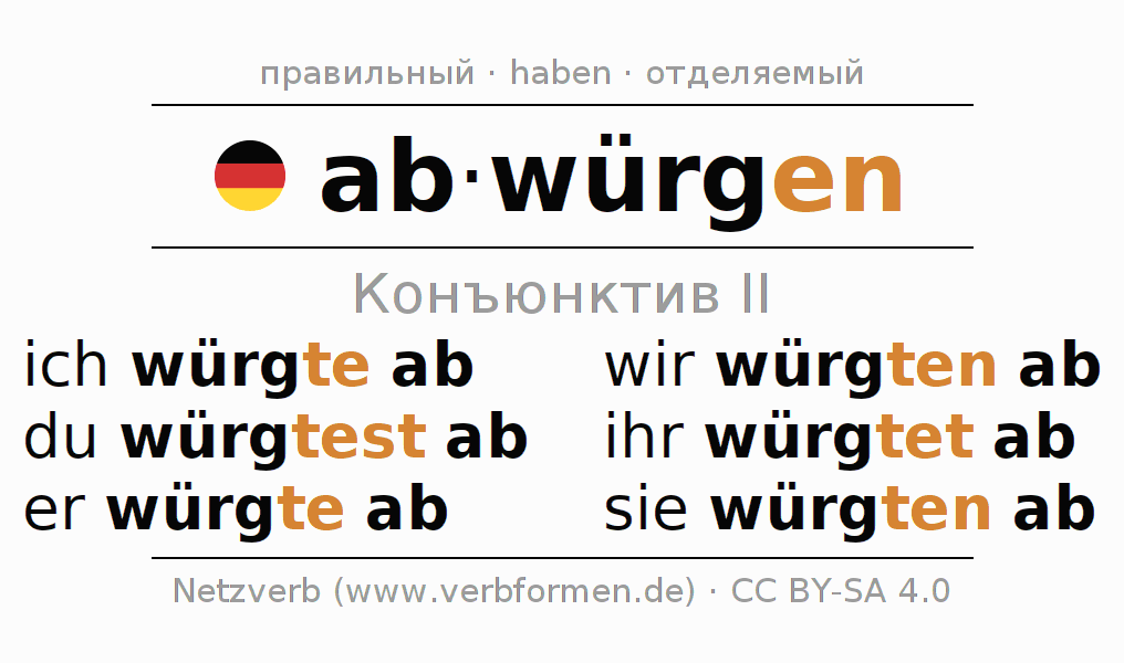 Спряжение abwürgen (заглушить, подавлять) в сослагательном наклонении II: ich würgte ab, du würgtest ab, er würgte ab, wir würgten ab, ihr würgtet ab, sie würgten ab