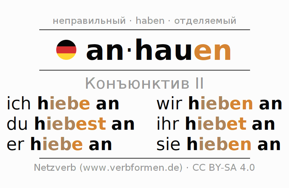 Спряжение anhauen (бить, зарубать) в сослагательном наклонении II: ich hiebe an, du hiebest an, er hiebe an, wir hieben an, ihr hiebet an, sie hieben an