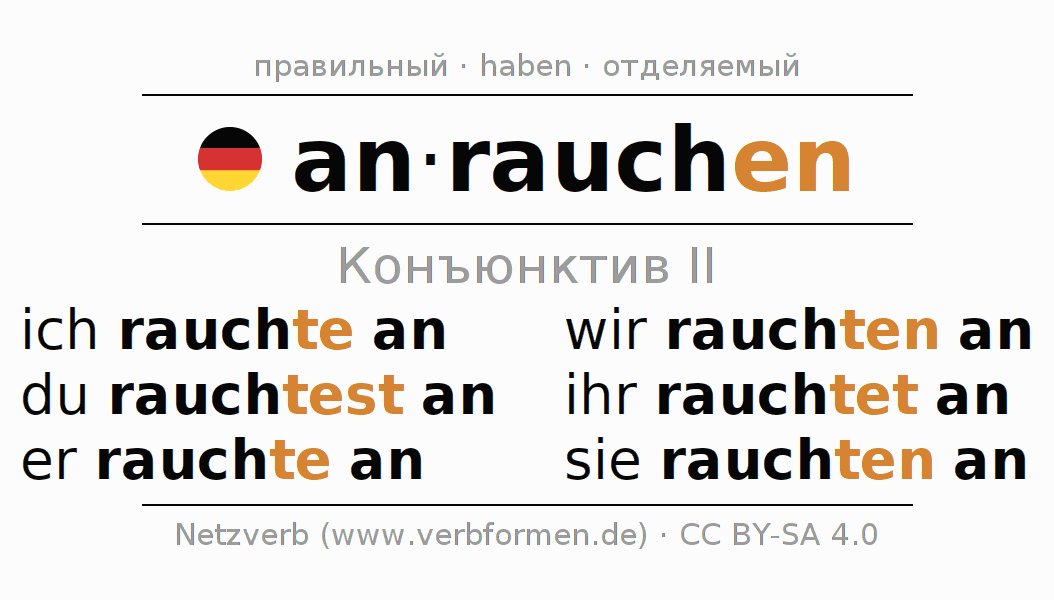 Спряжение anrauchen (закуривать, закурить) в сослагательном наклонении II: ich rauchte an, du rauchtest an, er rauchte an, wir rauchten an, ihr rauchtet an, sie rauchten an