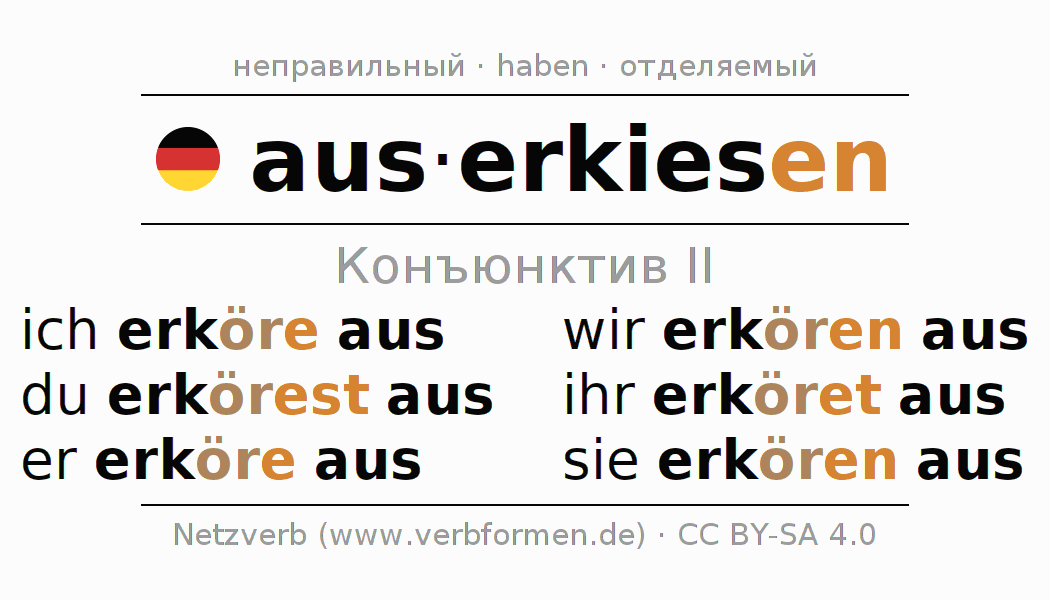 Спряжение auserkiesen (избирать, выбирать) в сослагательном наклонении II: ich erköre aus, du erkörest aus, er erköre aus, wir erkören aus, ihr erköret aus, sie erkören aus