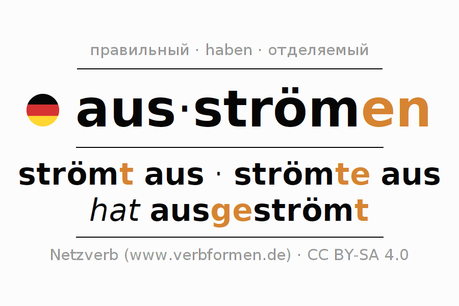 Спряжение ausströmen (излучать, веять) в сослагательном наклонении II: ich strömte aus, du strömtest aus, er strömte aus, wir strömten aus, ihr strömtet aus, sie strömten aus