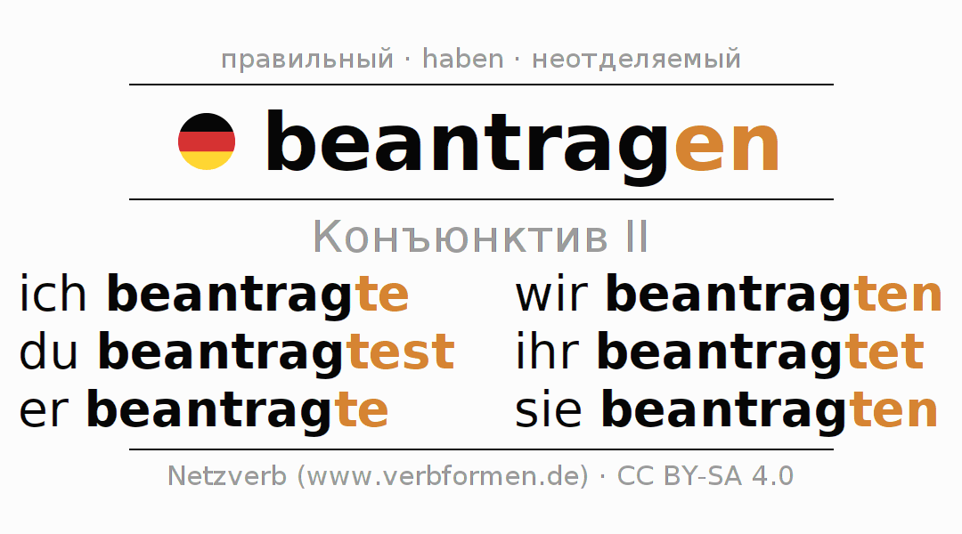 Спряжение beantragen (подать заявку, ходатайствовать) в сослагательном наклонении II: ich beantragte, du beantragtest, er beantragte, wir beantragten, ihr beantragtet, sie beantragten