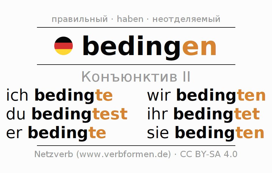 Спряжение bedingen (обусловливать, обуславливать) в сослагательном наклонении II: ich bedingte, du bedingtest, er bedingte, wir bedingten, ihr bedingtet, sie bedingten