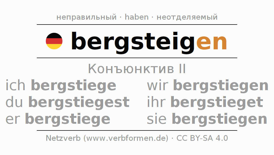 Спряжение bergsteigen (альпинизм, горный туризм) в сослагательном наклонении II: ich bergstiege, du bergstiegest, er bergstiege, wir bergstiegen, ihr bergstieget, sie bergstiegen