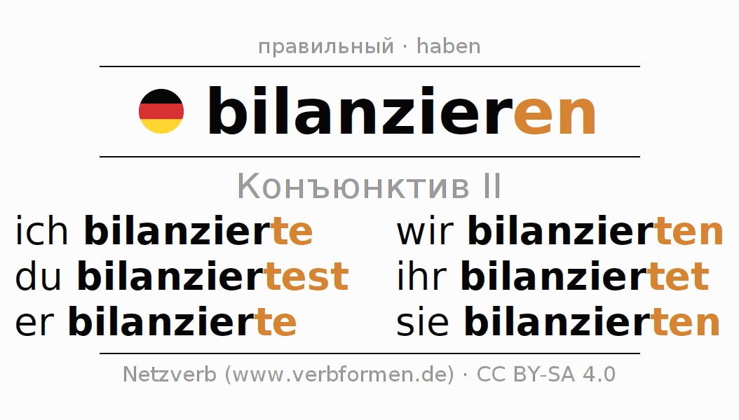 Спряжение bilanzieren (балансировать, подводить итог) в сослагательном наклонении II: ich bilanzierte, du bilanziertest, er bilanzierte, wir bilanzierten, ihr bilanziertet, sie bilanzierten