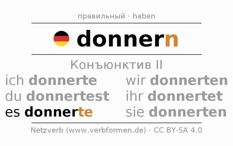 Спряжение donnern (греметь, громыхать) в сослагательном наклонении II: ich donnerte, du donnertest, es donnerte, wir donnerten, ihr donnertet, sie donnerten
